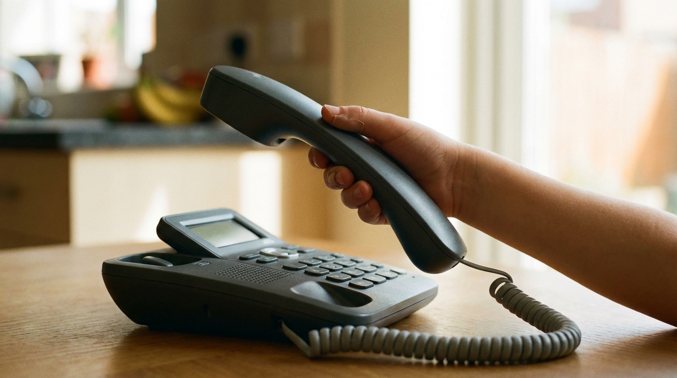 The device is a professional VoIP desk phone that connects to your home WiFi network. It sits on a desk or kitchen counter and stays there. Your child picks up the physical receiver, dials a four-digit code, and connects to approved contacts including UK mobiles, landlines, or 999 emergency services.